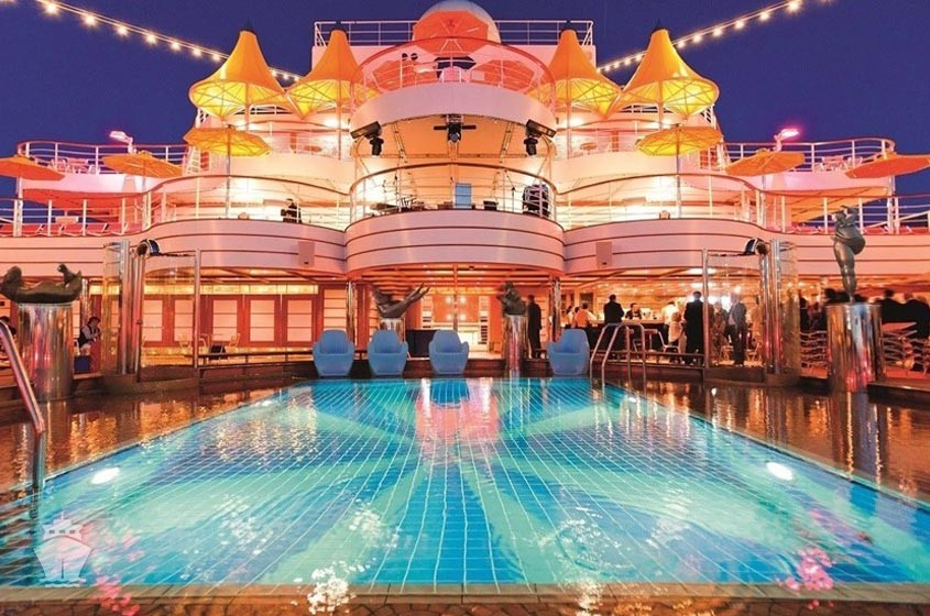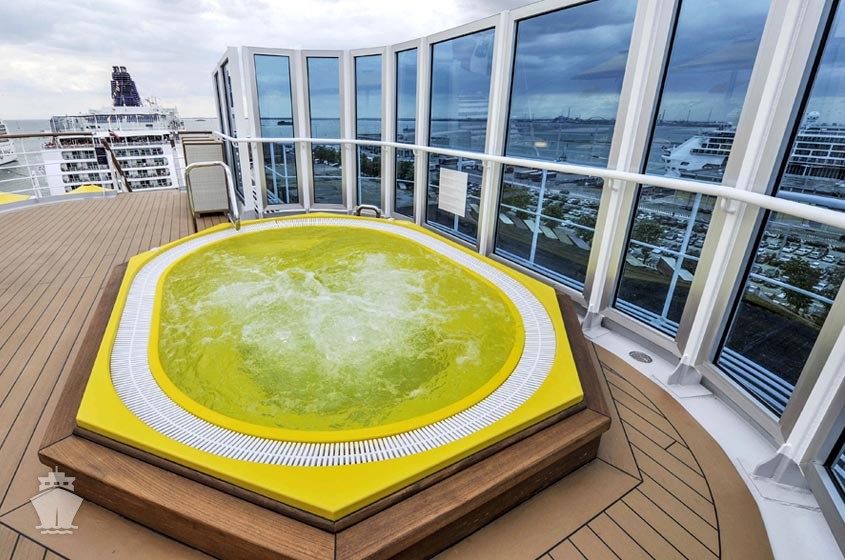 - otevřený bazén na horní palubě, 1 bazén s posuvnou prosklenou střechou, bazén pro děti s vodním miniparkem