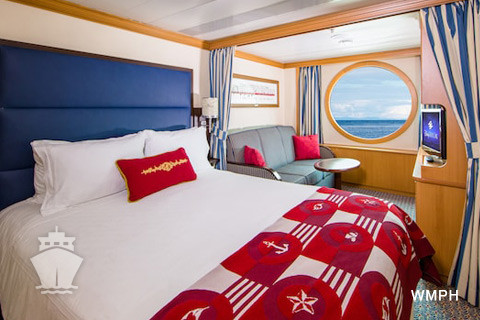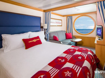 Zařízení kajut: dvoulůžková queen postel (matrace Posturepedic Sealy, ložní prádlo z egyptské bavlny), skříň, koupelna se sprchou, vanou a WC, vysoušeč vlasů, kosmetika H20 + spa (šampon, kondicionér a tělové máslo), obývací část se sofa a stolkem, oddělitelná závěsem, 22 palcová plochá Tv, bezpečnostní schránka, telefon s přímou linkou, zrcadlo, regulovatelná klimatizace.