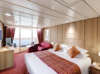 Suite s balkónem: cca 27 m², kajuta s manželskou postelí (na požádání 2 oddělené postele) a rozkládací pohovka. Klimatizace, koupelna s vanou a WC, toaletní stolek, prostorná skříň, interaktivní TV, telefon, minibar, sejf, vysoušeč vlasů. Balkon se stolkem a židlemi.