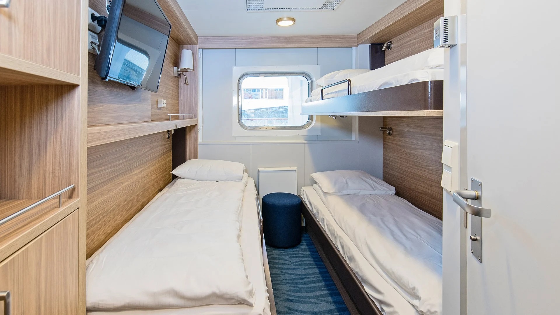 Kajuty vnitřní a s oknem nemají velkou plochu, ale mají dostetk úložných prostor.