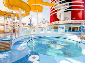 Hlavní bazén a plochy kolem něj jsou rovněž zaměřeny na rodiny s dětmi; je zde i bazén pro menší děti s Mickey tobogánem a bazének s malými fontánkami pro batolata. Na lodích Magic a Wonder je jeden bazén určen pouze pro dospělé, zatímco na Dream a Fantasy dospělácká oblast zahrnuje několik palub a barů.