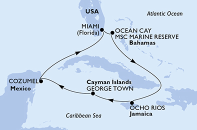 - Západní Karibik: zastávky na ostrově Ocean Cay MSC Marine Reserve, Cozumel v Mexiku, George Town na Kajmanských ostrovech a Ocho Rios na Jamajce