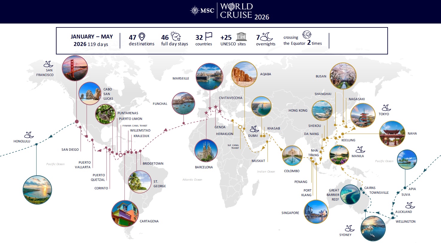 Před nedávnem se otevřel prodej na plavbu kolem světa lodní MSC Magnifica 2026. Krásná výletní loď na své 4měsíční trase navštíví 47 unikátních destinací ve 32 zemích světa a 2x překročí rovník.