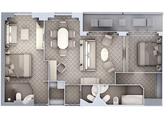 | R2 - Royal Suite 2 96 m² (včetně balkona), oddělená obývací časť a 2 ložnice, 2 koupelny | 3 256 094 Kč 1 085 365 Kč za osobu |