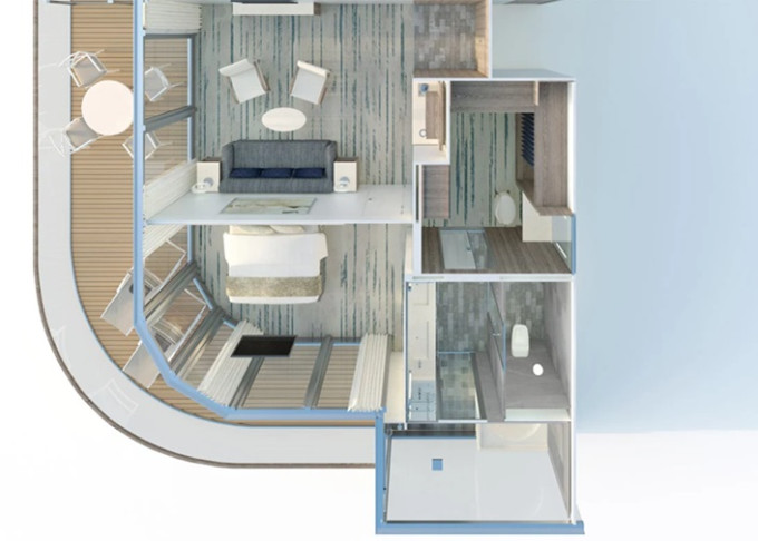 | R1 - Royal Suite 1 83 m² / veranda 28 m². Ložnice, oddělená obývací časť, koupelna s vířivkou a výhledem na moře. | 1 503 646 Kč 751 823 Kč za osobu |
