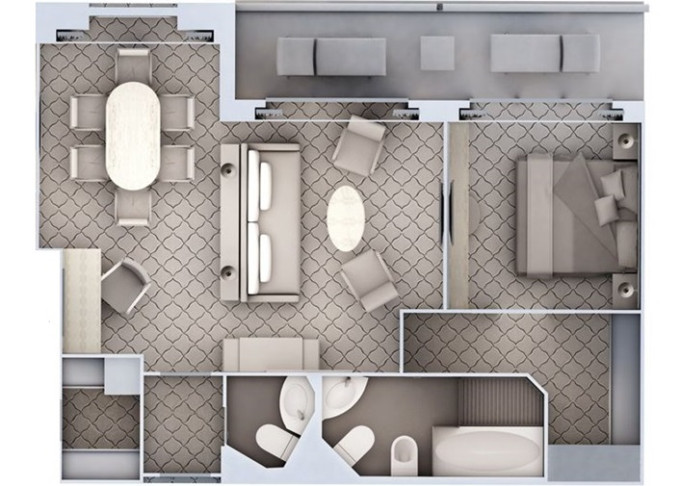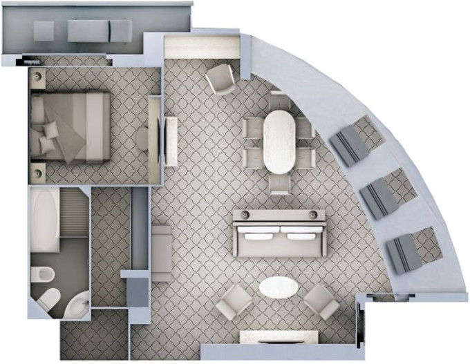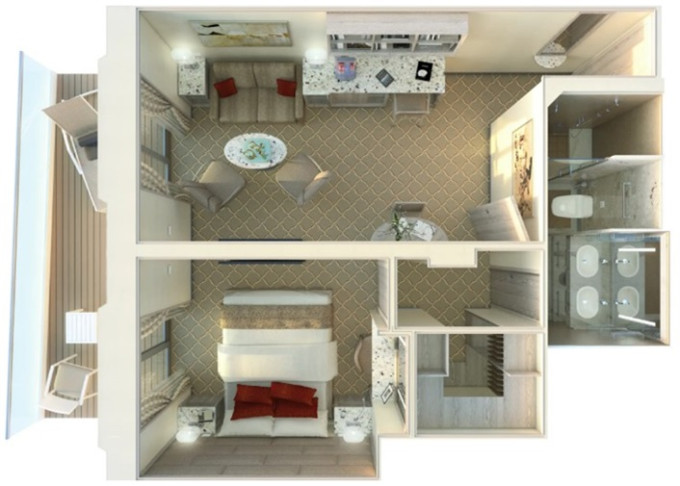 | R1 - Royal Suite 1 69 m² (včetně balkona). Obývacia časť s jedálňou, oddělená ložnice. | 1 588 569 Kč 794 285 Kč za osobu | ||
