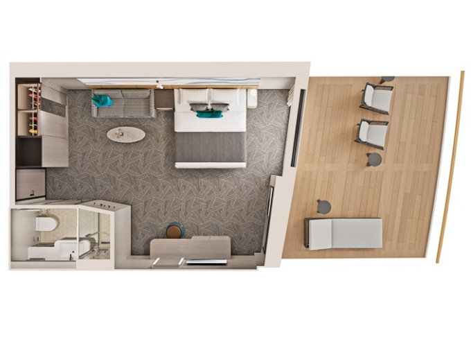 | SH - Suite s velkým balkónem Aft-Facing 25 m² / balkón 34 m². 9. paluba - vzadu. Max 2 osoby. Výhody Suite. | 119 240 Kč 59 620 Kč za osobu |