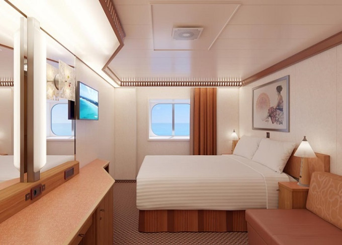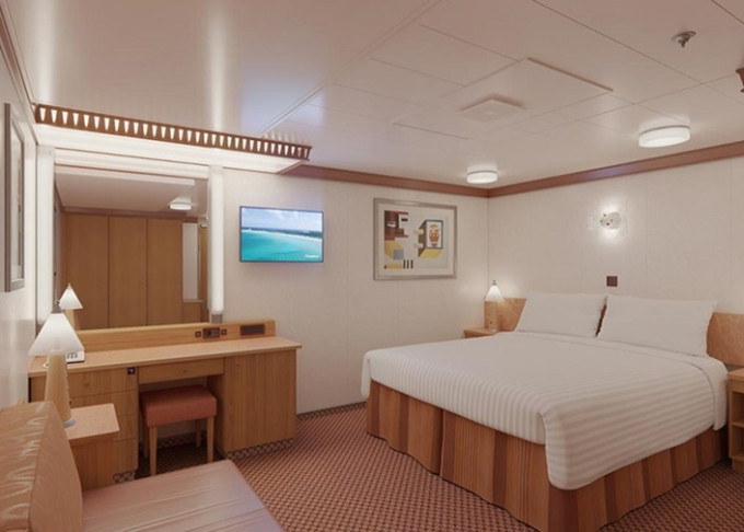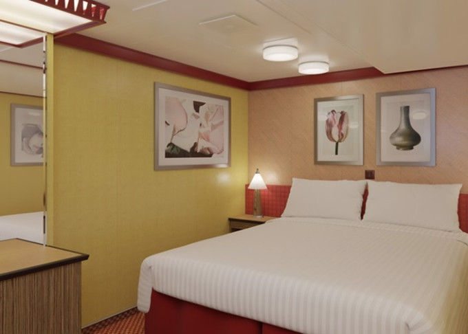 Základní vybavení všech kajut: koupelna se sprchou a WC, TV, telefon, zásuvka 110 AC, regulovatelná klimatizace, postele Carnival Comfort, vysoušeč vlasů, trezor, minibar.