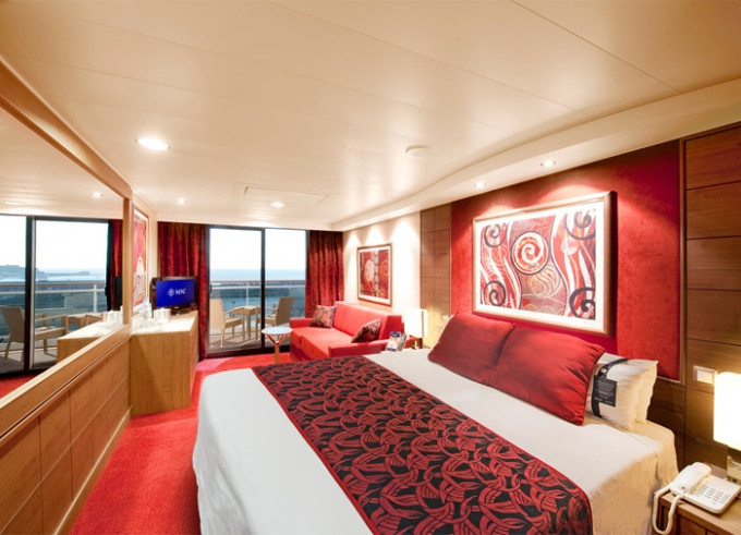 Suite s balkónem: cca 31 m², kajuta s manželskou postelí (na požádání 2 oddělené postele) a rozkládací pohovka. Klimatizace, koupelna s vanou a WC, toaletní stolek, prostorná skříň, interaktivní TV, telefon, minibar, sejf, vysoušeč vlasů. Balkon se stolkem a židlemi.