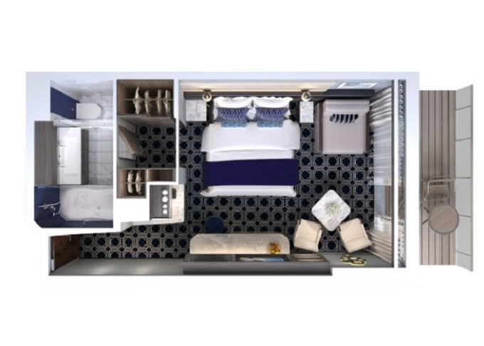 | B1 - Kajuta s balkonem Aft-facing od 20 m² / balkon od 4 m². 9. až 15. paluba - vzadu. Max 2-3 osoby. | 58 720 Kč 29 360 Kč za osobu | ||