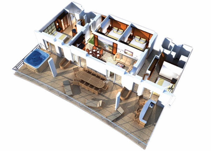 | VS - Villa Suite / 4 ložnice 112 m² / balkon s vířivkou 75 m². Výhody Royal Suite Class. 6. paluba. Max 14 osob. | 125 142 Kč 31 286 Kč za osobu |
