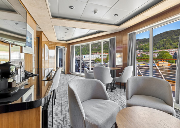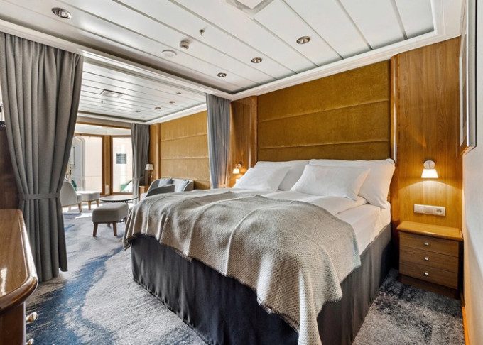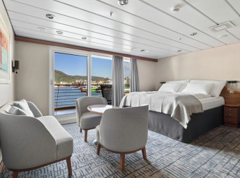| M2 - Expedition Suite na hornej palube s balkónom 23 m². Balkon (některé mají pouze okno!). 1 nebo 2 pokoje. Obývací část, TV, varná konvice, minibar. Dárek na uvítanou. Max 2 osoby. | 422 092 Kč 211 046 Kč za osobu |