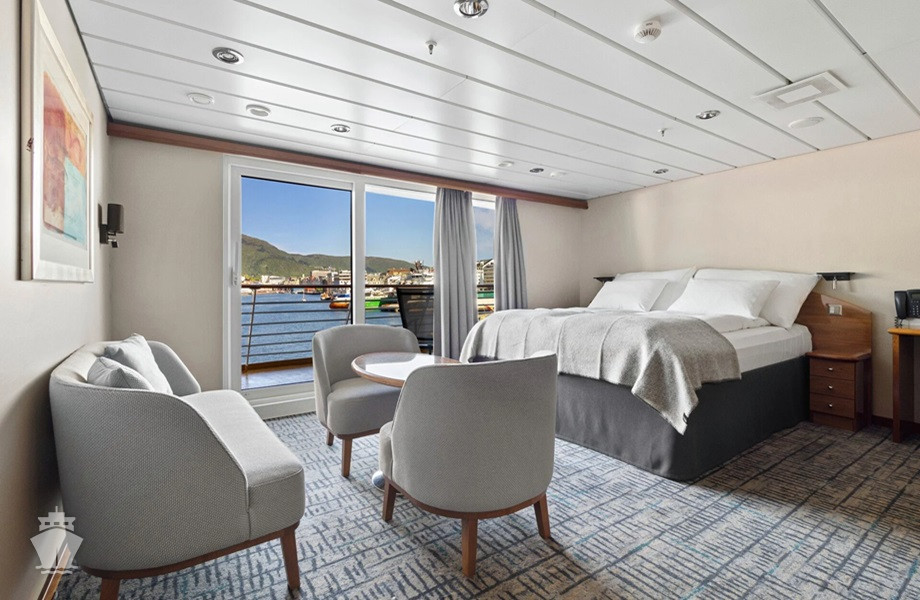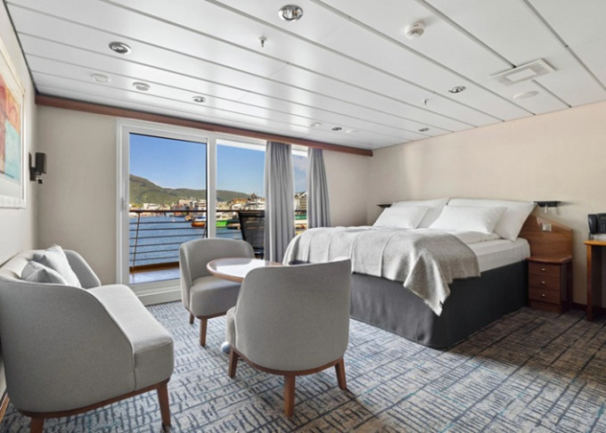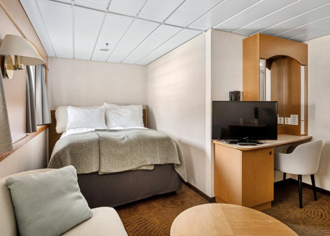 | QJ - Vnější kajuta Arctic Superior 16 - 17 m². Neotevíratelné okno s omezeným výhledem. Oddělené postele, obývací část. Tv, varná konvice, minibar. Max 2 osoby. | 267 740 Kč 133 870 Kč za osobu | ||