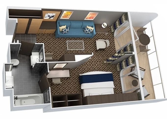 | 3U - Vnitřní kajuta s virtuálním balkonem 15 m². Obrazovka velkosti balkonových dverí s promítaným výhledem. 7. až 12. paluba. Max 2-4 osoby. | 125 967 Kč 41 989 Kč za osobu |