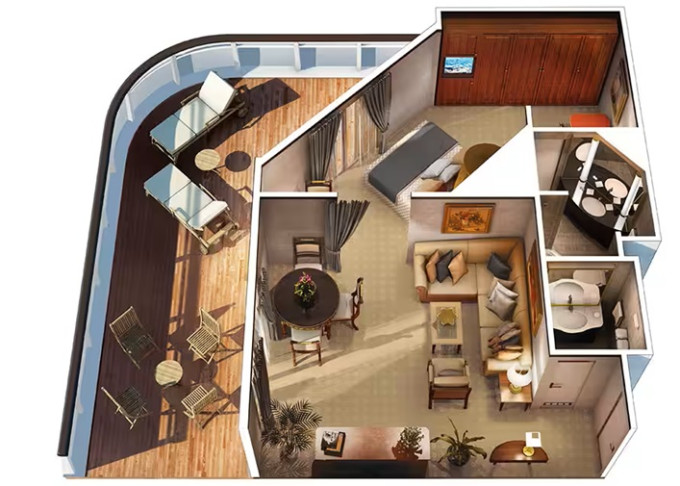 OC - Oceania Suite 77 m² + balkon s vířivkou od 16 m². Výhody Oceania Suite. 11/12. paluba. Max 2-3 osoby. 3 izby: Ložnice, obývací místnost, jedáleň, mediálna místnost s 50″ LCD Tv, 2 koupelny (1 s vířivkou), šatník, extra wc. 393 082 Kč 196 541 Kč za osobu