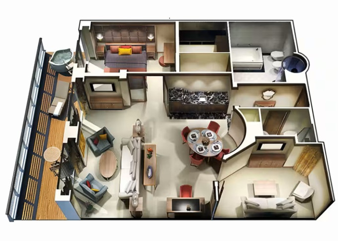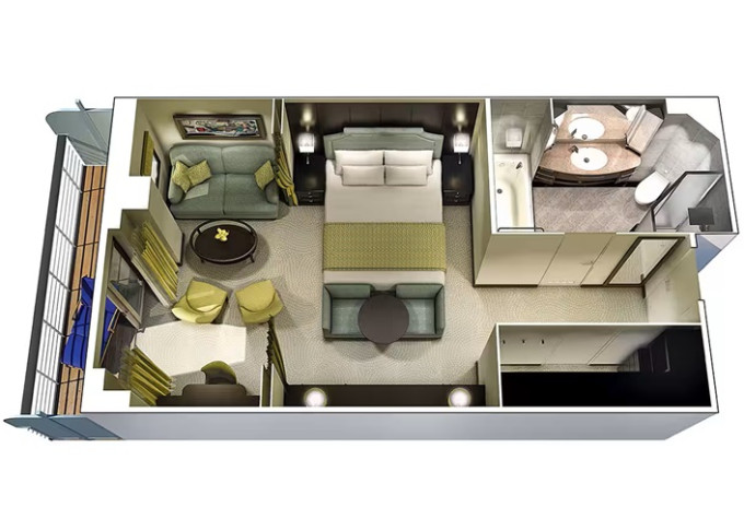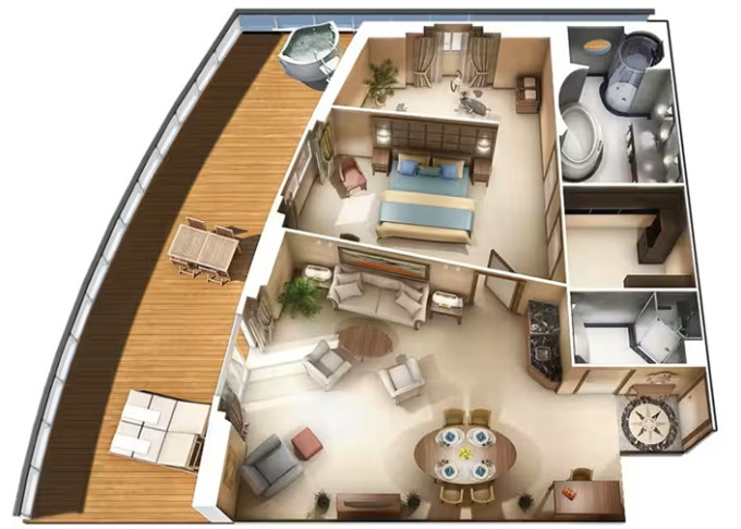 OS - Owner’s Suite 123 m² + balkon s vířivkou od 62 m². Výhody Owners Suite. 8/9/10. paluba. Max 2-3 osoby. 4 izby: vstupná hala s pianom, ložnice, velká obývací místnost s jídelní částí, 2 koupelny (1 s vířivkou), 2 šatníky. 552 636 Kč 276 318 Kč za osobu