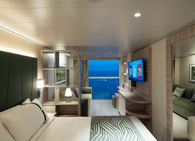 Kajuty Infinite - VL1, VL2 - s panoramatickým oknem; některé kajuty jsou s oknem, které se po otevření změní na skleněnou balustrádu.