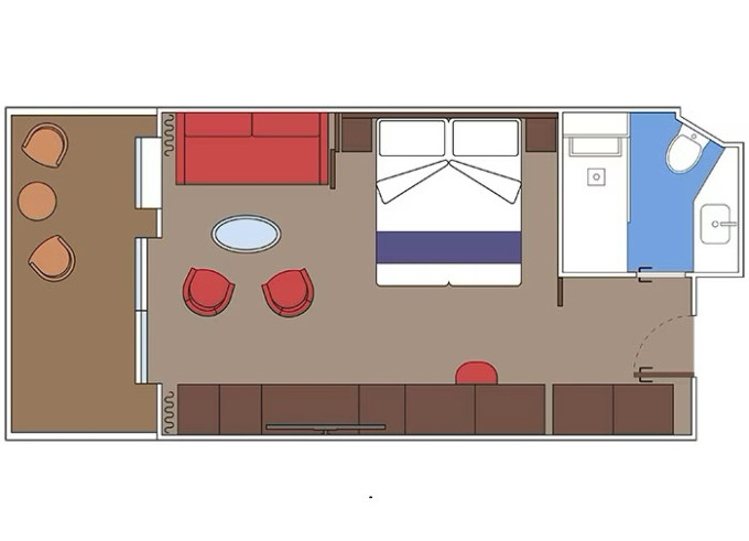 Kajuta s balkónem: 16 - 17 m², kajuta s manželskou postelí (na požádání 2 oddělené postele) a rozkládací pohovka. Klimatizace, koupelna se sprchou nebo vanou a WC, toaletní stolek, prostorná skříň, interaktivní TV, telefon, sejf, vysoušeč vlasů, virtuální asistentka ZOE. Balkony se stolkem a židlemi. Některé kajuty mají omezený výhled; kajuty PR1, PR2, PR3, PV mají výhled na promenádu.