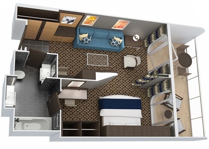 | 1U - Vnitřní kajuta s virtuálním balkonem 15 m². Obrazovka velkosti balkonových dverí s promítaným výhledem. 9/10. paluba. Max 2-4 osoby. | 46 216 Kč 15 405 Kč za osobu | ||