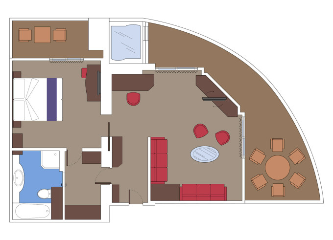 | YC3 - Yacht Club Royal Suite 58 m² + rohový balkon s vířivkou 70 m². Oddělená obývací část a ložnice, šatník, koupelna s vanou a sprchou. 15. paluba. Cenový model MSC Yacht Club. | 266 640 Kč 133 320 Kč za osobu |
