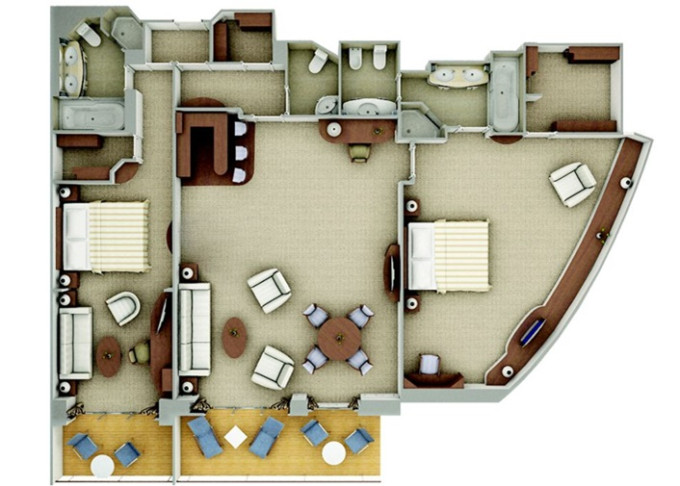 | R2 - Royal Suite 2 122-126 m² (včetně balkona). Royal Suite R1 spojená s Veranda Suite. | 1 978 218 Kč 494 555 Kč za osobu |