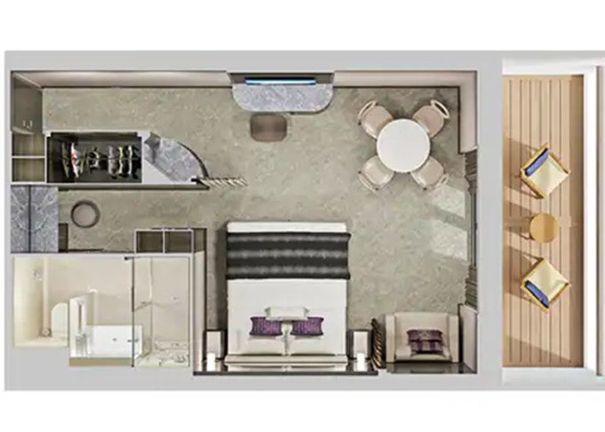 Suite: luxusní varianta ubytování na nejlepších místech na lodi, prostorné a luxusně vybavené; více variant včetně suite v privátní zóně The Haven