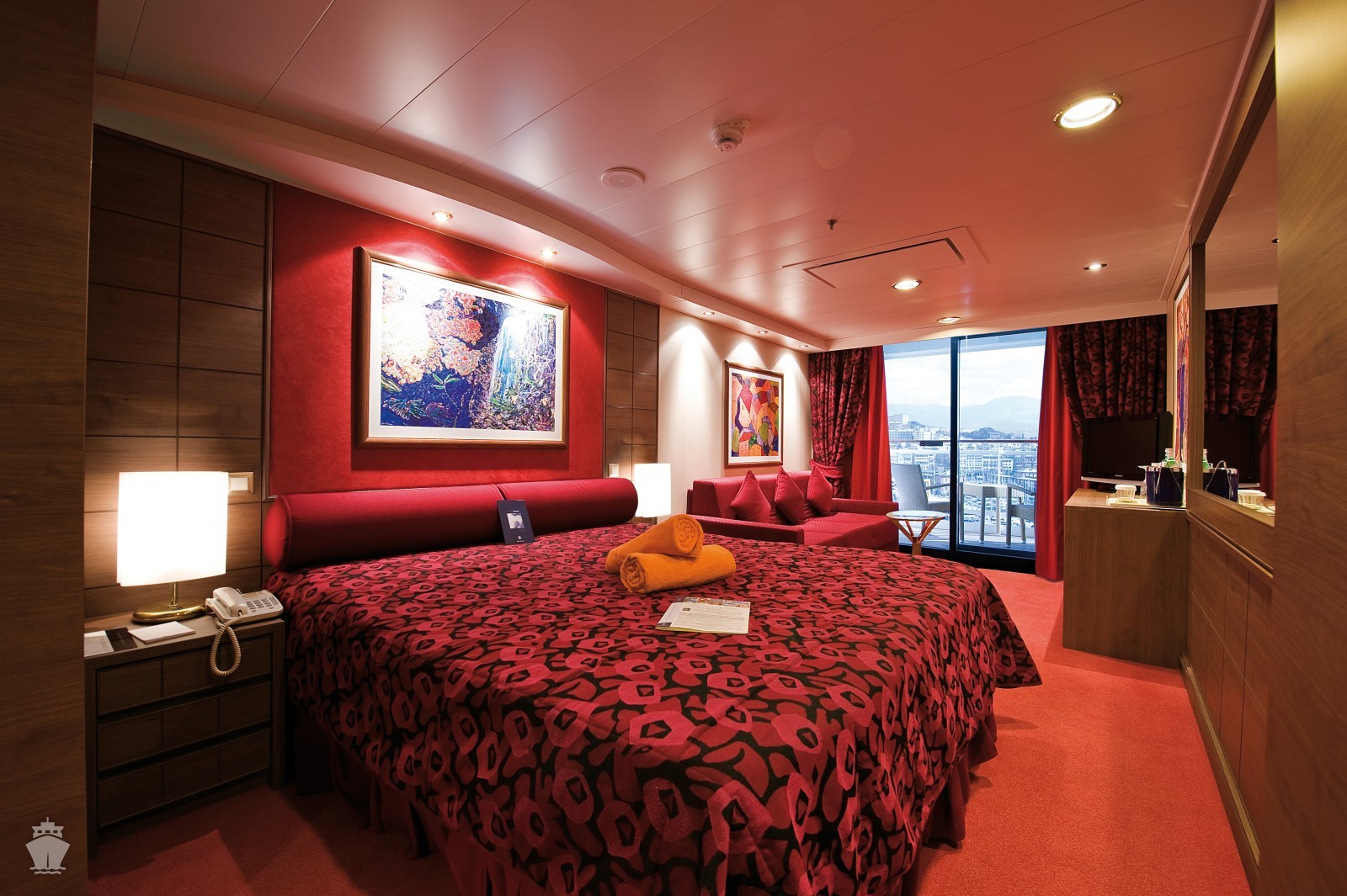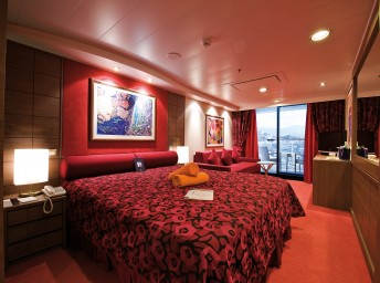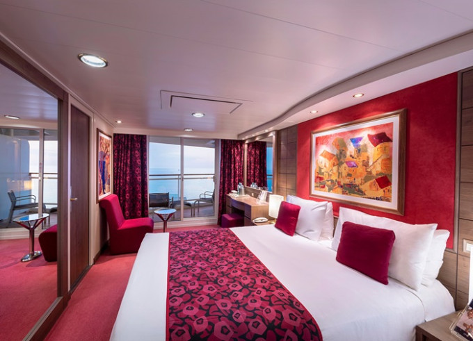 Suite s balkónem: cca 31 m², kajuta s manželskou postelí (na požádání 2 oddělené postele) a rozkládací pohovka. Klimatizace, koupelna s vanou a WC, toaletní stolek, prostorná skříň, interaktivní TV, telefon, minibar, sejf, vysoušeč vlasů. Balkon se stolkem a židlemi.