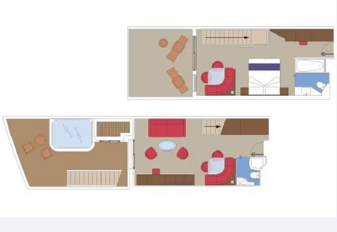 YJD - Yacht Club Duplex Suite s vířivkou 46 m² + balkón 30 m². Vířivka. 2 podlaží, šatník, 2 koupelny (1 s vanou). Max 4 osoby. 16. paluba. Cenový model MSC Yacht Club. 198 817 Kč 198 817 Kč za osobu