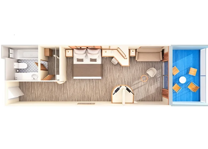 | 8C - Kajuta s balkonem 21,5 m² (včetně balkonu). 11. a 12. paluba. | 25 859 Kč 12 929 Kč za osobu |