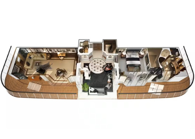 | OS - Owner’s Suite 123 m² + balkon s vířivkou od 62 m². Výhody Owners Suite. 8/9/10. paluba. Max 2-3 osoby. 4 izby: vstupná hala s pianom, ložnice, velká obývací místnost s jídelní částí, 2 koupelny (1 s vířivkou), 2 šatníky. | 1 146 835 Kč 573 418 Kč za osobu | ||