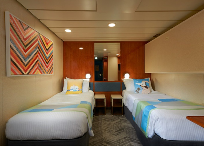 koupelna se sprchou a WC, 2 lůžka, v některých kajutách možnost přistýlek, toaletní stolek, úložné prostory, interaktivní TV, sejf, telefon, vysoušeč vlasů.